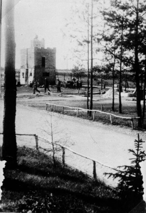 'As the spring of 1943, approached, the Germans began developing and expanding the camp. They brought in a truck, driven by an SS man, and ordered construction materials - cement, iron and bricks. All of this was dumped in a heap between the pair of matching wooden huts where the Germans lived. These structures had been covered with straw to insulate them for the winter; now this was stripped off and we could assess the design of the buildings. Down the centre of each hut ran a corridor, with living quarters on either side...... The kitchen and mess hall - the latter furnished with little tables covered with snow-white tablecloths -were located in the front. There was a gap 5 meters wide between these huts, and here the Germans ordered us to erect a structure consisting of a corridor and a single room. A small detail of prisoners began to build . A few weeks later, when the walls were already standing, the Germans issued a strange command. Instead of having us clap a tar-covered wooden roof on the new building, like those of the other buildings in the camp, the Germans ordered one of poured concrete.